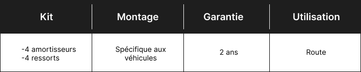 Ces combinés filetés profitent d’une conception bitube alliant qualités dynamiques et confort, au profit d’une amélioration sensible des performances par rapport à l’origine. Entièrement noirs, ils bénéficient d’une finition neutre et discrète. La fermeté est réglable sur 14 positions et la hauteur de caisse peut être ajustée sur une large plage en vissant le corps de l’amortisseur dans son support.